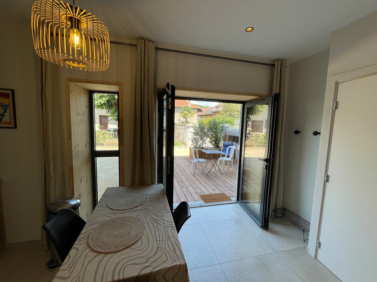 Studio indépendant de notre maison. Vous entrez par la salle de vie avec baie vitrée offrant une belle clarté et équipée de rideaux occultant afin d'obtenir l'obscurité souhaitée. Jolie terrasse en bois, abritée. Cuisine équipée : plaques de cuisson, hotte , four, réfrigérateur, micro-onde, cafétière, bouilloire. Chambre lit double, penderie, bloc rangement. Salle de bain douche/lavabo/WC. Place de parking et accès portillon dédié.
