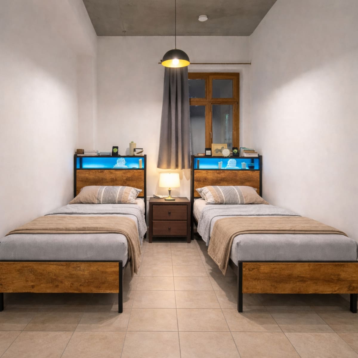 Mūsu kopmītnē ir četras ērtas gultas. Ir svaiga gultas veļa un skapīši, un katra gulta ir aprīkota ar kontaktligzdām. Koplietošanas vannasistaba atrodas tieši blakus istabai. Internets bez maksas visā mājā.