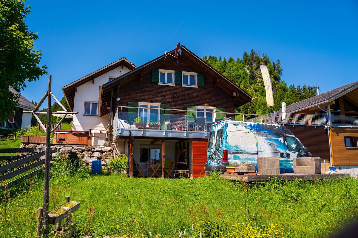Mēs piedāvājam nelielu, bet ar mīlestību iekārtotu mājokli ģimenēm ar maksimālo skaitu. 2 pieaugušie un 2 bērni vai pāris. Viena guļamistaba ar divguļamo gultu un divstāvīgo gultu , privātu tualeti/dušu un nelielu minivirtuvi ar piederumiem. Atrodas Šveices centrā, lauku saimniecībā ar unikāliem skatiem. 5-10 minūšu laikā ar automašīnu jūs esat lieliskā sākuma punktā dažādām aktivitātēm. Ierašanās ir iespējama tikai ar vienu automašīnu, nav sabiedriskā transporta savienojuma.