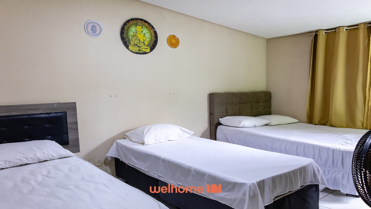 02 quartos - 1 casal com ar e outro com 02 cama de solteiro com ventilador. Cozinha, sala de estar, varanda e banheiro com chuveiro elétrico, Wi-Fi e garagem.