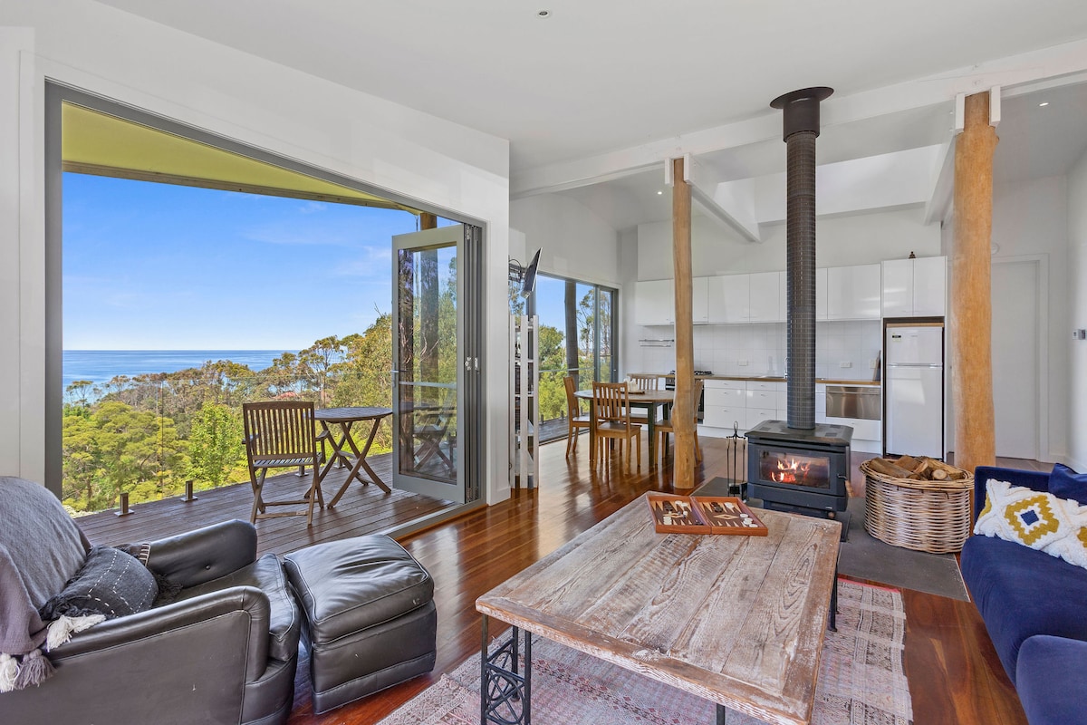 Mostieties virs Dienvidu okeāna ar netraucētu skatu no katras dzīvojamās telpas. Šī ir jūsu privātā atpūtas vieta piekrastē, kas atrodas 27 privātu akru platībā Otvejas kalnos un piedāvā lietusmeža pastaigu, ūdenskritumu un dzīvniekus, kurus var pabarot ar rokām. Mājdzīvnieki ir laipni gaidīti iekštelpās, un ir pieejams liels, pilnībā nožogots dārzs. Viesi saka, ka skati ir vēl labāki nekā bildēs. Ar saules enerģiju darbināma, ar lietus ūdeni apgādāta un elektromobiļiem piemērota – tā ir dzīve bez pieslēguma tīklam un bez kompromisiem. Pieslēdzieties tīklam, kad vēlaties, un pilnībā iegremdējieties dabā, kad to nevēlaties.