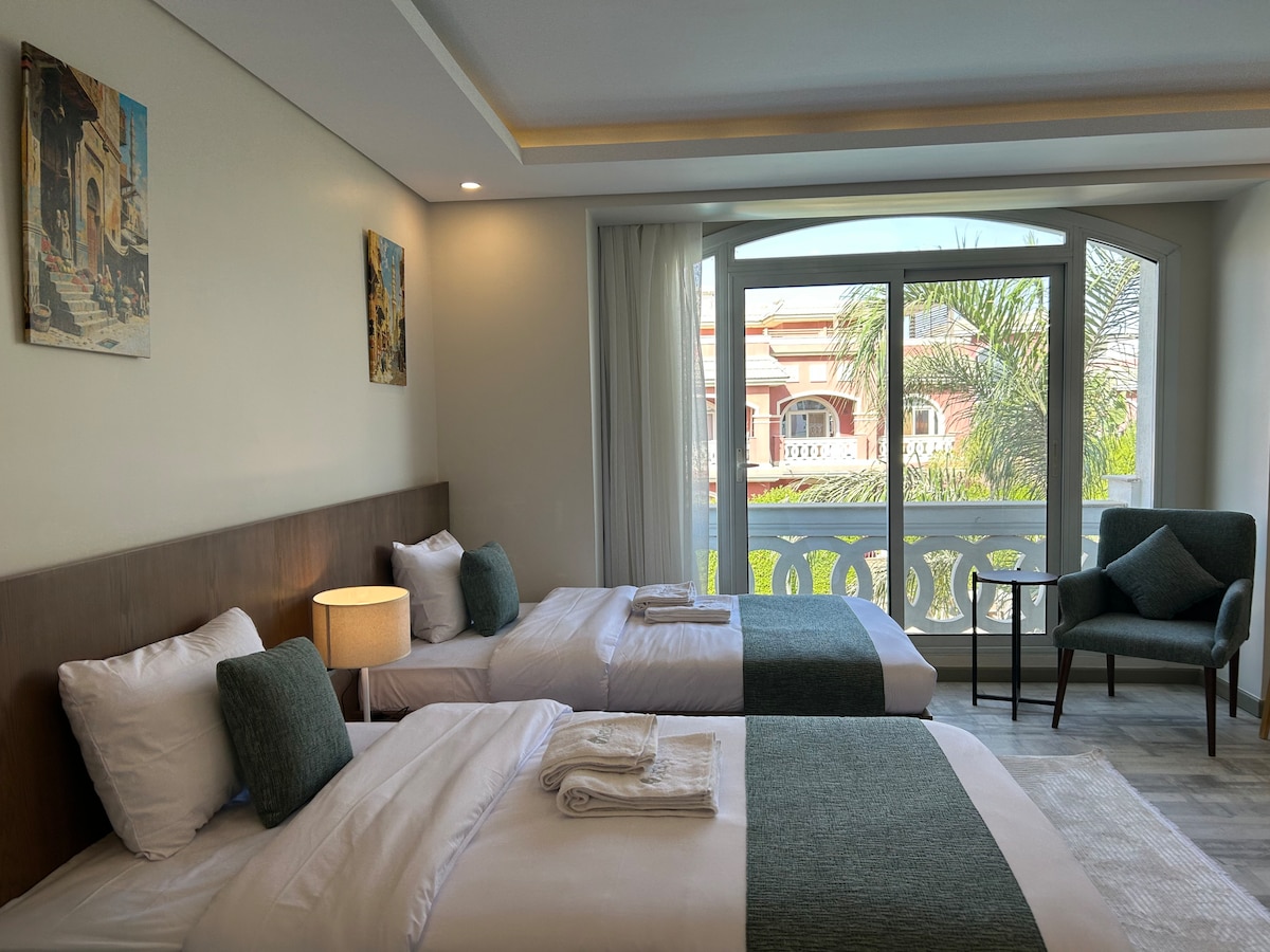 A luxurious 2-master-bedroom apartment in Silver Palm, New Cairo, featuring premium marble flooring, solid oak wall panels, and centralized AC. It includes two elegant master suites, a guest bathroom, and a modern American kitchen. The apartment overlooks the pool, fountain, and lush garden, with a spacious balcony and a billiard table, offering a refined and relaxing stay in one of the finest compounds in the 5th Settlement.