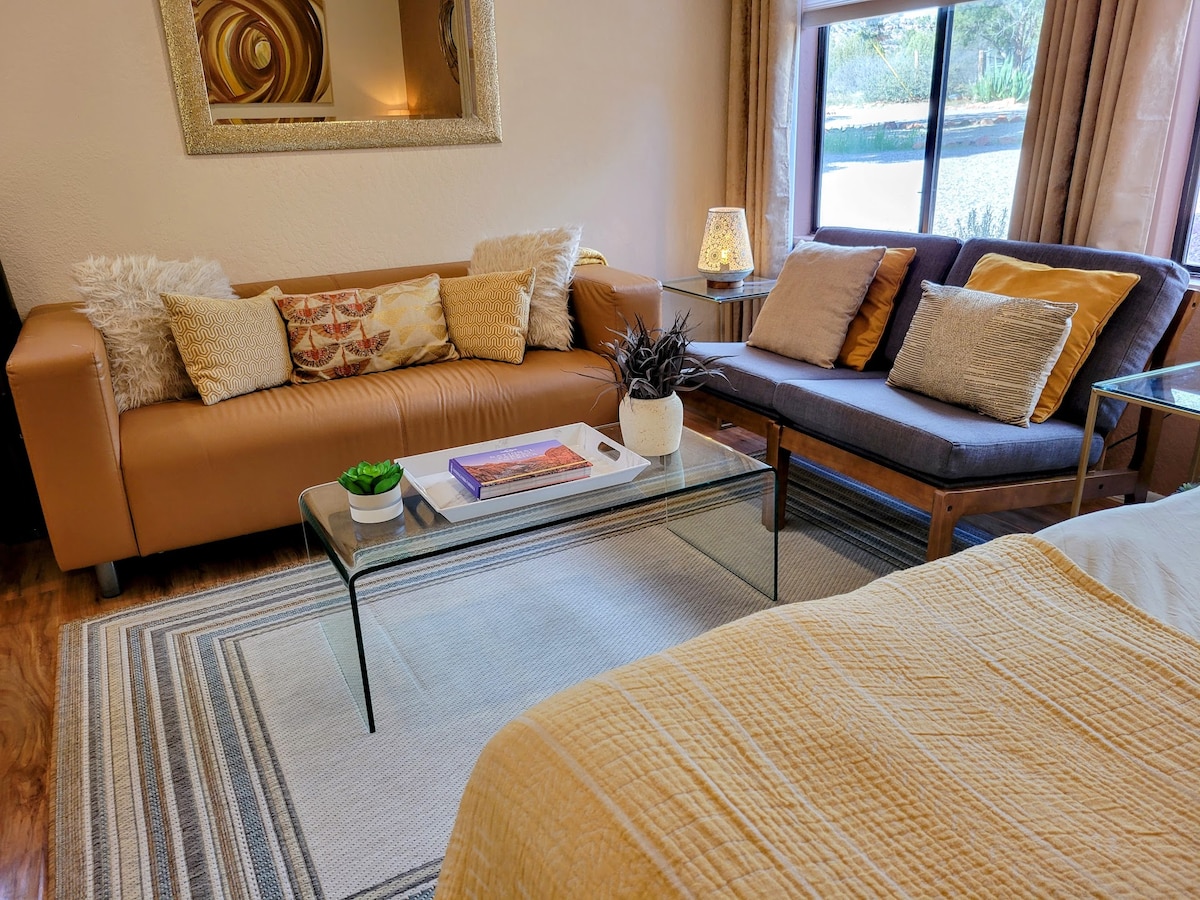 Jūtieties kā mājās pašā Sedonas sirdī, pastaigas attālumā no dažām no labākajām pārgājienu takām. Mūsu pievienotais viesu nams/studija piedāvā privātu plašu klāju, lielisku skatu uz Red Rock un 24' baseinu (maijs-oktobris). Izbaudiet ērtu divguļamo gultu, virtuvīti (mini ledusskapis, mikroviļņu krāsns, indukcijas plīts virsma, kafijas automāts un daudz kas cits), plakanā ekrāna viedtelevīzija, koka grīdas, vannasistaba ar vannu, melnas žalūzijas, otra (karstā) āra duša, āra ugunsdzēsības galds, gāzes grils un privāta ieeja un pagalms!