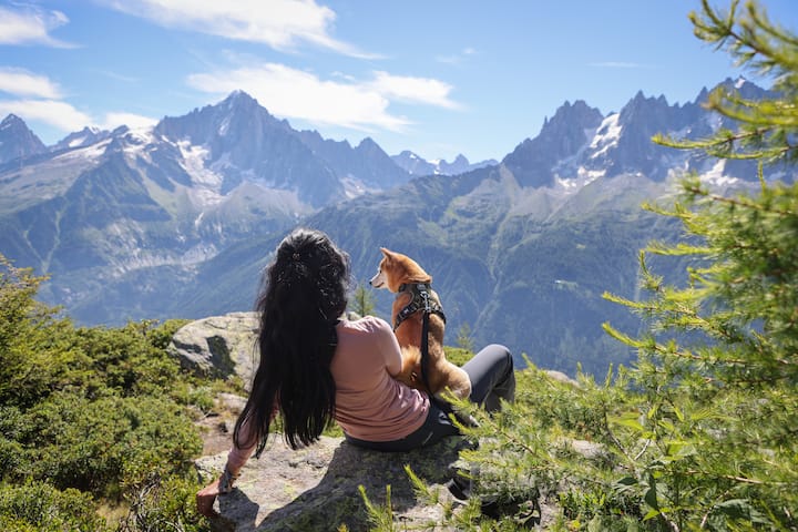 60 minūšu privāta fotosesija ar jūsu suni Les Gaillands ar Monblānu, ezeru un mežu