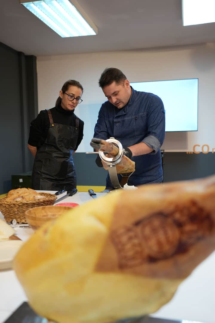Ibērijas šķiņķis, kas sagriezts līdz nažam, gatavs nogaršot. Stilīgs un pārdomāts noformējums uz dēļa vai paplātēm. Kopā ar picos y regañás.