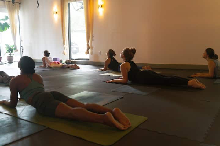 Piedalieties grupu jogas nodarbībā ar apzinātām kustībām un atbalstošu, mierīgu kopienu.