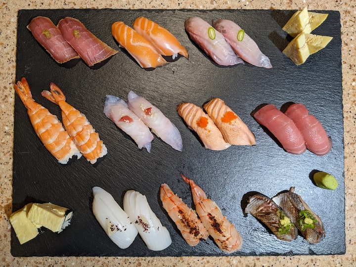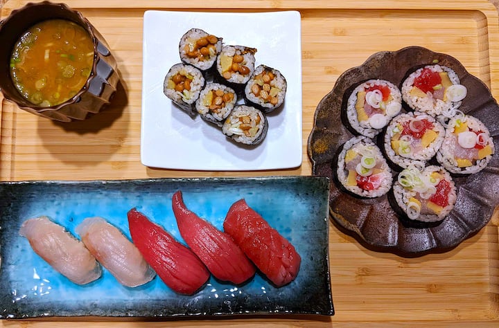 Suši vakariņas ar vietējām vai audzētavā ilgtspējīgi audzētām zivīm, uzkodām, nigiri, rullīšiem, zupu un desertu vienā komplektā.