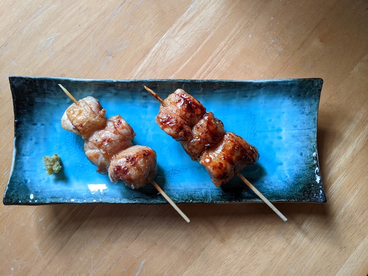 - 2 japāņu gaļas bumbiņas uz iesmiem (tsukune), kas pagatavotas no cūkgaļas, liellopu gaļas, melnajiem ķiplokiem un dažādām citām garšvielām, lai radītu sulīgu un neaizmirstamu garšu.