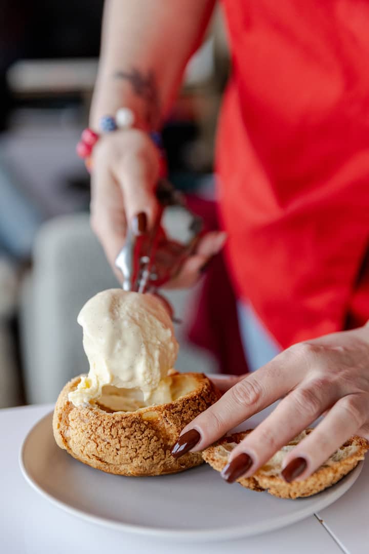 Izbaudiet uz vietas pagatavotus profiteroles: mīkstus kraklēnu šū konditorejas izstrādājumus, kas pildīti ar bagātīgu vaniļas saldējumu un pārklāti ar karstu un krēmīgu šokolādes mērci, ko papildina karstas šūketes tieši no cepeškrāsns.