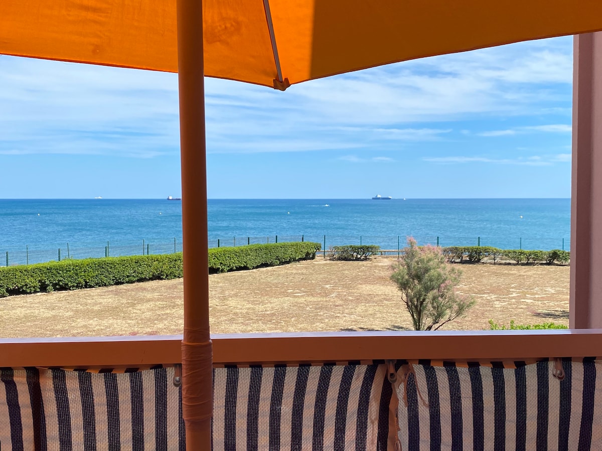 Dzīvesvieta 1. līnijā jūrā. Satriecošs skats! Ar baseinu, 2 tenisu, privātu autostāvvietu. DZĪVOKLIS - aprīkota virtuve, cepeškrāsns, mikroviļņu krāsns, trauku mazgājamā mašīna, liels ledusskapis, 1 gulta 2 vietas, lielisks komforts (dīvāns/gultas rapido matracis 15cm), plakanā ekrāna televizors, ventilators... - 2 guļamistabas ieejas zālē - Atsevišķa tualete - Vannasistaba ar vannu/dušu Terase - 8 m2, aprīkota ar galdu un 4 krēsliem - 1 autostāvvieta pagrabā, kas paredzēta dzīvoklim un velosipēdu istabai.