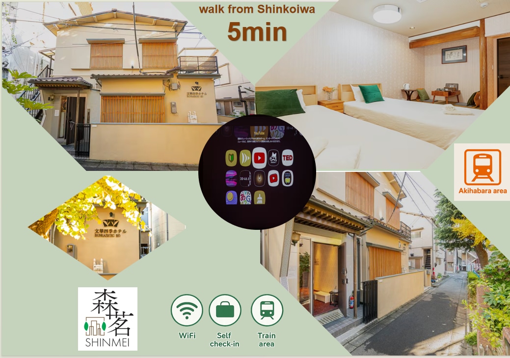 Shin-Koiwa Guesthouse-7-min walk from the station! 🚃 Transportation: - 33-min from Shinjuku - 15-min from Akihabara, 25-min from Tokyo. - Quick connections to Narita/Haneda Airports 🛒 Super convenient living - Shin-Koiwa South Exit shopping street. Surrounded by supermarkets, popular restaurants, and late-night ramen shops, experience authentic Japanese life and soothe travel fatigue. 🌳 Japanese-style neighborhood - Take a morning stroll to Shin-Koiwa Park to experience Tokyo life.