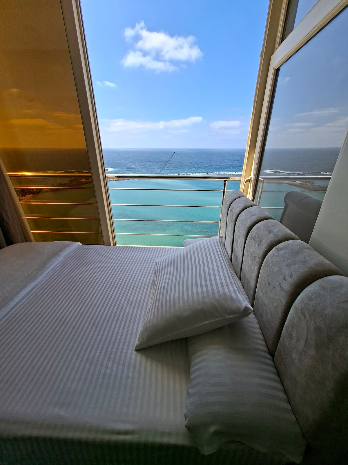 Jūsu greznā, atjaunotā Vidusjūras atpūtas vieta Aleksandrijā 18. stāvā! 🌊🏖️ Iedomājieties, ka pamostoties no katra dzīvokļa stūra paveras panorāmas skats uz jūru – pat no gultas! Šis plašais dzīvoklis ir ideāli piemērots ģimenēm, lai maksimāli izbaudītu jūru. 3 guļamistabas ar gaisa kondicionētāju, katrā divas 120 cm platas gultas. No ēdamistabas, uzgaidāmās telpas un dzīvojamās istabas paveras elpu aizraujošs skats uz jūru rietumu, ziemeļu un austrumu pusē, kas ir ideāli piemērots, lai izbaudītu svaigu, vēsu vēju un sildītos siltā saulē.