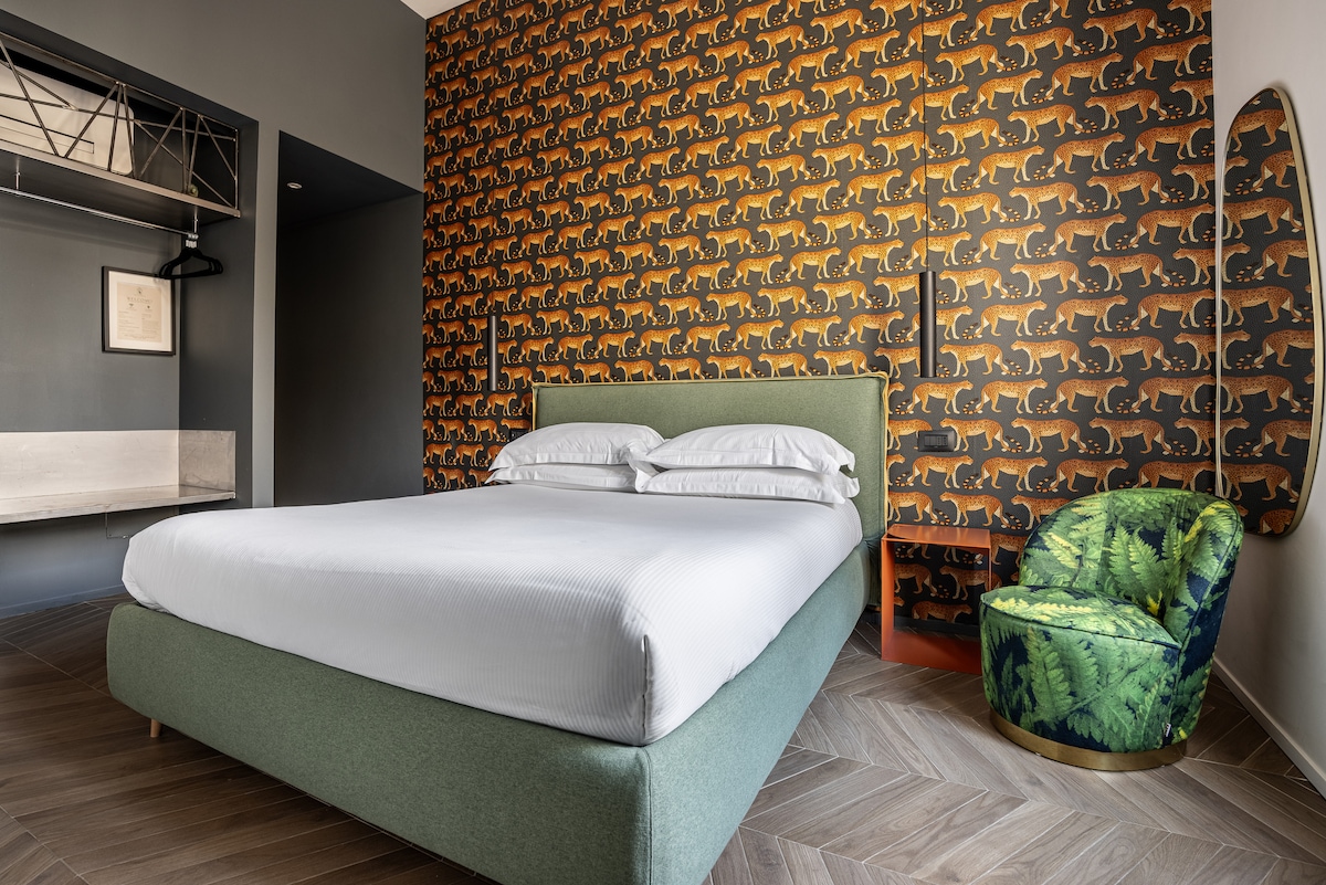 Situata al terzo piano, la matrimoniale di oltre 30 mq offre un letto a baldacchino in ferro di 160 cm, area relax, scrivania e armadio. Il bagno, di circa 4,5 mq, include wc, bidet, lavabo e piccola vasca sotto il lucernario. La stanza ha l'utilizzo esclusivo della terrazza a tetto della torre.