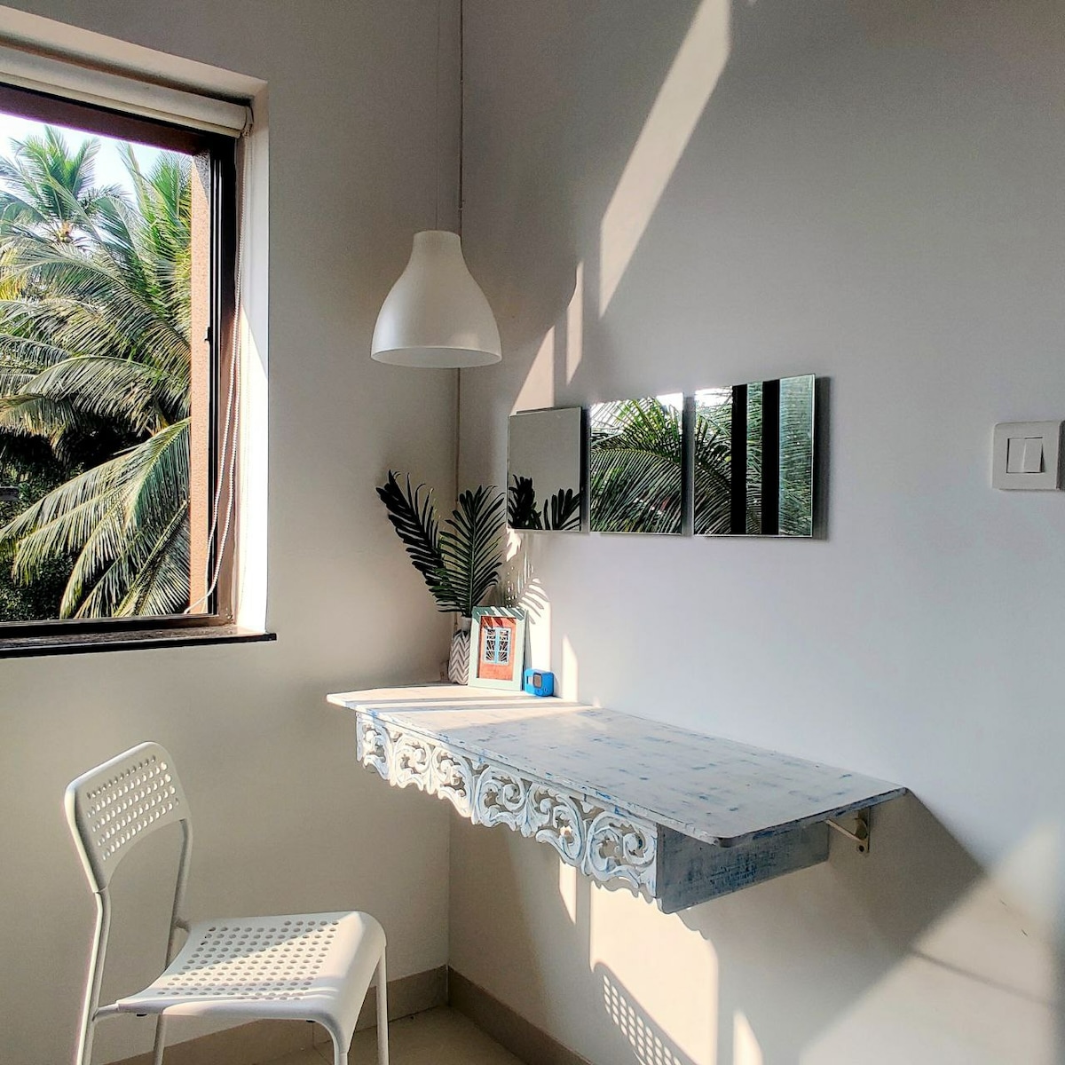 Eze by Earthen Window is a light-filled 1-bedroom duplex penthouse in Siolim, inspired by the calm, elevated charm of French hillside village by the same name. Thoughtfully styled with soft whites, warm wood, and curated details, the home features a cozy attic and a private garden terrace opening to uninterrupted green views. Set within a secure gated community with a pool, cafe, elevator, and high-speed Wi-Fi, it’s designed for quiet mornings, slow evenings, and effortless Goan living.