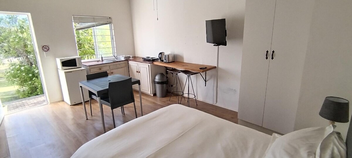 A tranquil indoor-outdoor living space ideal for couples or business travelers. The stylish studio opens up onto a large patio with braai. Enjoy our long summers outdoors! The studio has a separate entrance from the main house. Queen bed with open walk-in shower & separate toilette . It has fiber WI-FI, full DSTV, a tiny kitchenette with tea/coffee facilities, toaster, microwave, fridge & single induction plate. Secure onsite parking. We have 2 Small dogs for added security.