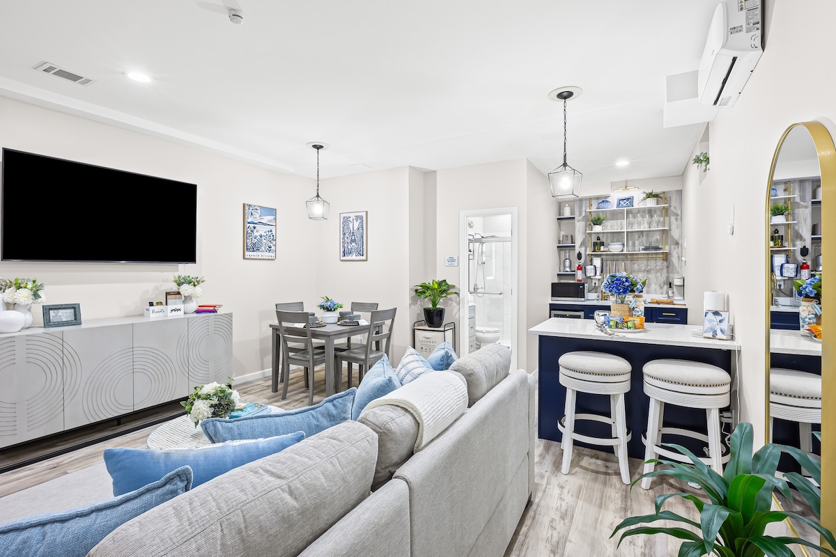 🌿 Welcome to Tranquility Getaway — a luxurious retreat nestled in the heart of Smithtown. Indulge in our Modern Newly Designed 2-bedroom Private Basement Luxe Suite, located on the left side of the property with a short staircase leading to your exclusive entrance on the lower level. Unwind in your private outdoor haven, featuring refined seating for four, a stone-top fire pit, and a solar-lit umbrella. THIS IS NOT THE ENTIRE HOUSE‼️ SO PLEASE REVIEW 📸 PHOTOS & HOUSE RULES BEFORE BOOKING‼️
