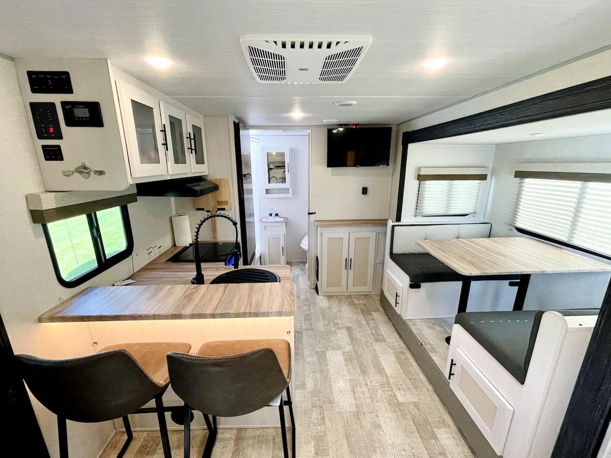 Šis RV ir visērtākais 2 pieaugušajiem un 2 bērniem, jo 2 gultas ir divstāvīgas gultas, 32" x 70". Galds pārtop par gandrīz pilnu gultu, vislabāk piemērots 1 pieaugušajam, un tajā ir ļoti ērta divguļamā gulta (Queen) ar privātuma durvīm. Šeit ir pieejamas visas papildērtības, izņemot veļas mazgājamo mašīnu/žāvētāju. Ir gāzes plīts un cepeškrāsns, propāna bbq, ledusskapis/saldētava, siltums/maiņstrāva, televizors ar Amazon ugunskura vietu un dvd, galds, krēsli un šūpuļkrēsli un grauzdēšanas nūjas, lai atpūstos ap ugunskuru. Jūs gaida skaisti skati, saulrieti, savvaļas dzīvnieki un putni!