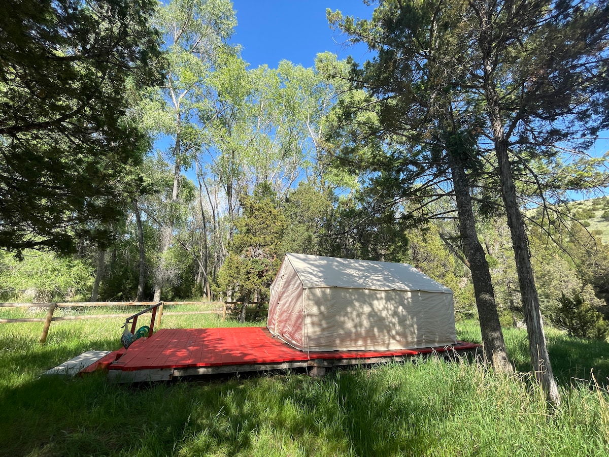 Glempinga vieta uz privāta ceļa blakus privātai upītei. Šī unikālā telts atrodas 6 jūdžu attālumā no KettleHouse amfiteātra, dažu minūšu attālumā no Clark Fork River, Rock Creek, Blackfoot un 20 minūšu attālumā no Mizūlas centra. Blakus esošajām teltīm ir kopīga grilēšanas zona ar piknika galdiem. Dabas ieskauta - ideāla vieta, kur baudīt klusu dabu un/vai koncertu nedēļas nogali. **JĀŅEM LĪDZI: gultasveļa (palagi, segas, spilveni), dvieļi un gaismas avoti.**