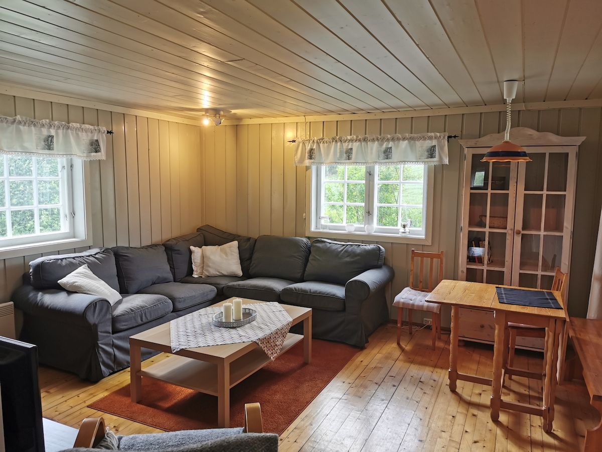 Vi leier ut en liten hytte som ligger inne på tunet på småbruket vårt. Hytta er på ca 50 kvadratmeter. Det er en romslig stue med en adskilt kjøkkenkrok. Det er familiekøyeseng på et soverom, og en dobbeltseng på et rom soverom. Hytta har en liten vedovn og fri tilgang på ved. Vi er tilgjengelige for spørsmål når det måtte være både på telefon og på epost.