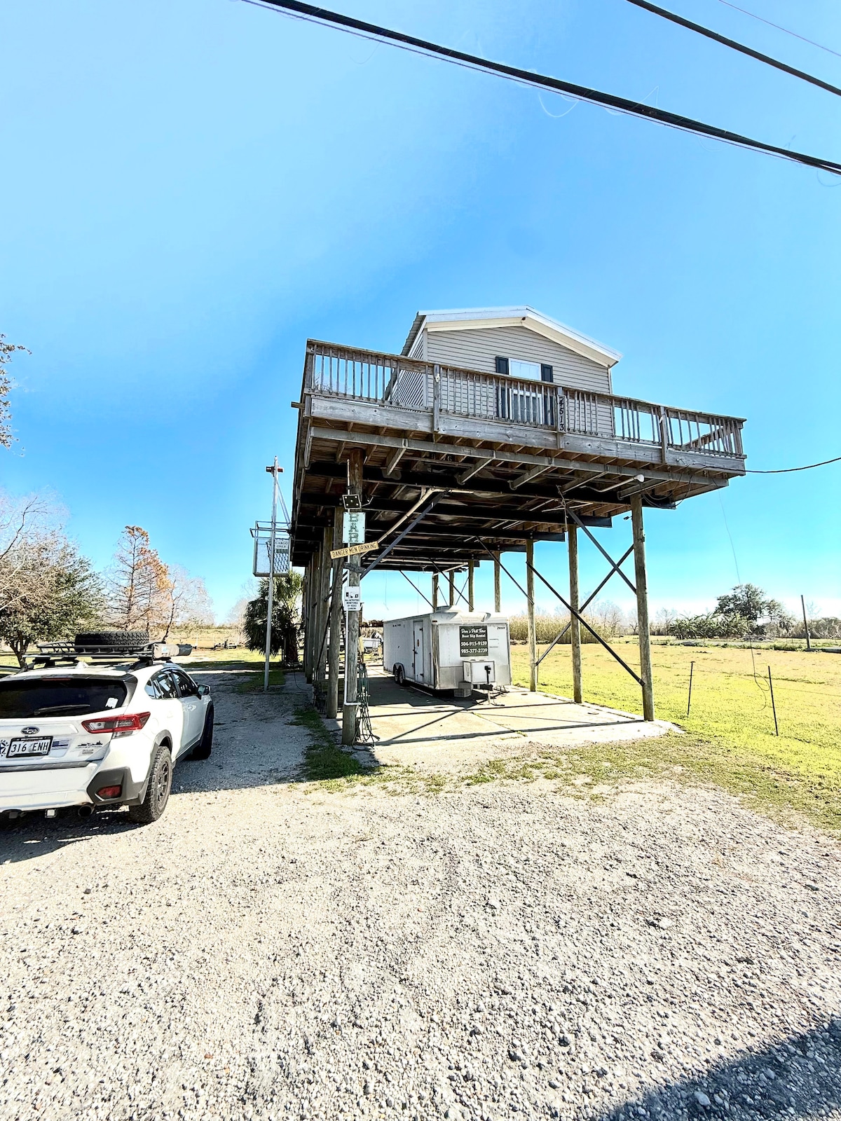 Relax with the whole family at this peaceful oasis away from home. Contemporary camp on the lake, perfect for your next fishing trip! Located only 30 minutes from downtown New Orleans and near many fishing charter and swamp tour options. The home includes 3 bedrooms, 2 full baths, full kitchen, dining space, and living space. The outdoor balcony and deck are great for watching the sunset or relaxing with a cold one. The deck includes ample dining space, hammocks, kayaks, and outdoor activities.