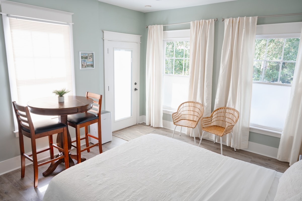Privāta studija, kas veidota no garāžas pārbūves, kas atrodas gaidāmajā West King rajonā. Atsevišķa ieeja ar slēdzeni bez atslēgas sagaida jūs šajā ērtajā, tīrajā telpā ar divguļamo gultu, savu vannasistabu, minivirtuvi un 2 pieejamām autostāvvietām piebraucamajā ceļā. Mini sadalītā maiņstrāva ērti atdzesē un apsilda studiju. Ātrgaitas internets, plakanā ekrāna televizors ar Netflix atpūtai pēc ekskursiju dienas. Velosipēdi mūsu vēsturiskā centra apskatei mazāk nekā 2 jūdžu attālumā.