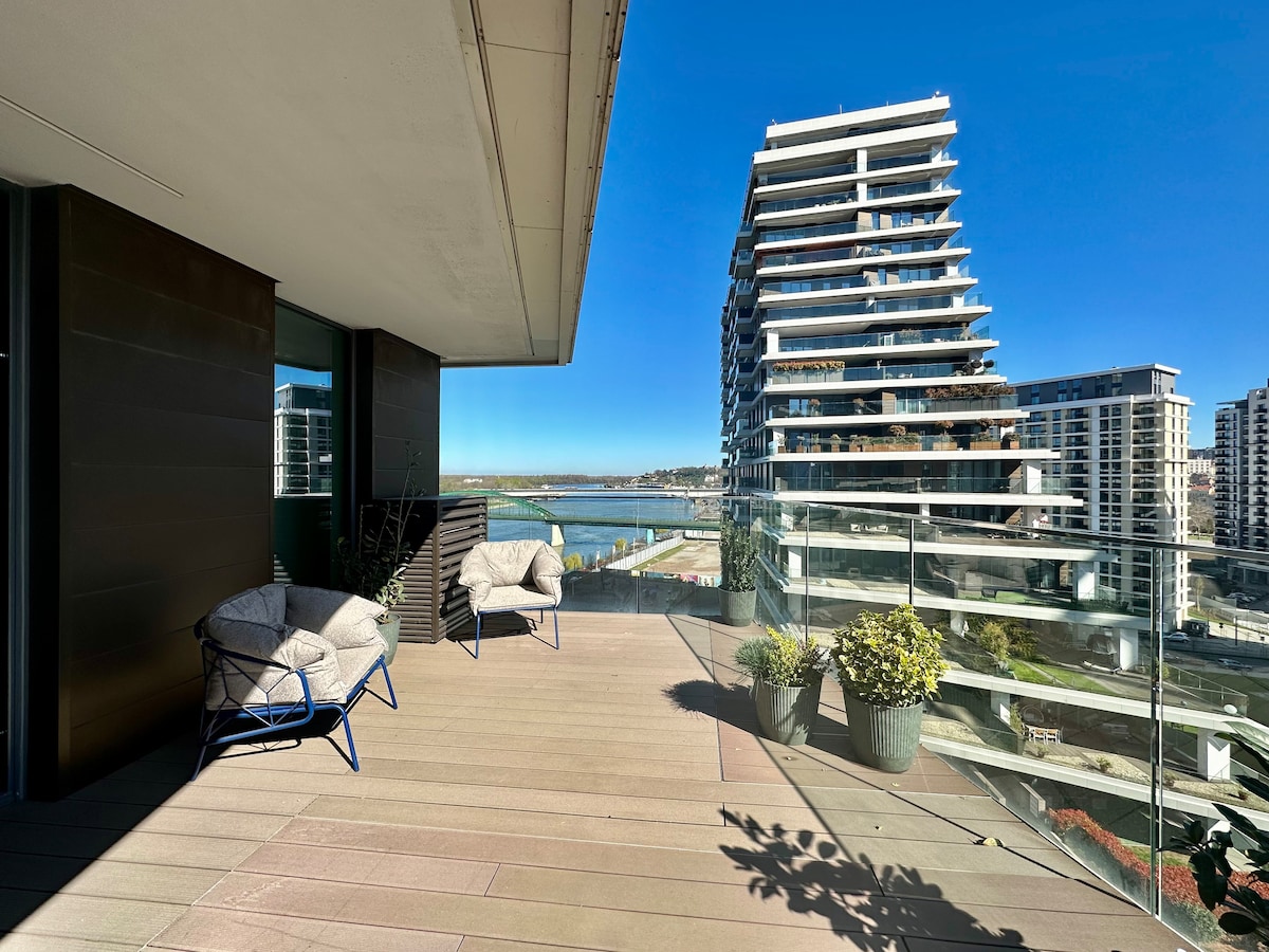 Šis plašais dzīvoklis pašā Belgradas krastmalā, kas ir ideāli piemērots romantiskai atpūtai, gaida jūs ! Dzīvoklim ir 2 lielas guļamistabas, 2 pilnas vannasistabas, atvērta virtuve, ēdamistaba un dzīvojamā platība, tajā ir kabeļtelevīzija un internets. Šim dzīvoklim ir liela terase ar skatu uz rietumiem, no kuras paveras skats uz Sava un Dunav upēm ,skats uz 3 tiltiem, Kalemegdanas cietoksni un skaistākajiem saulrietiem. Tā atrodas vienā no jaunākajām un vēlamākajām luksusa ēkām jaunizveidotajā Belgradas krastmalā.