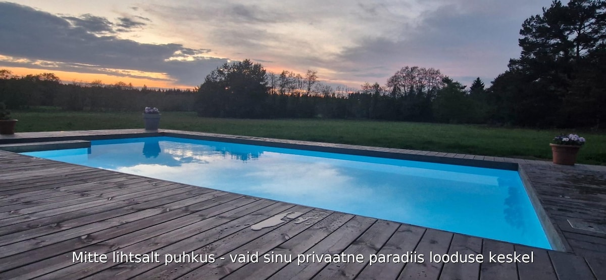 Māja mežā · Saulaina atpūtas vieta dabā ar baseinu