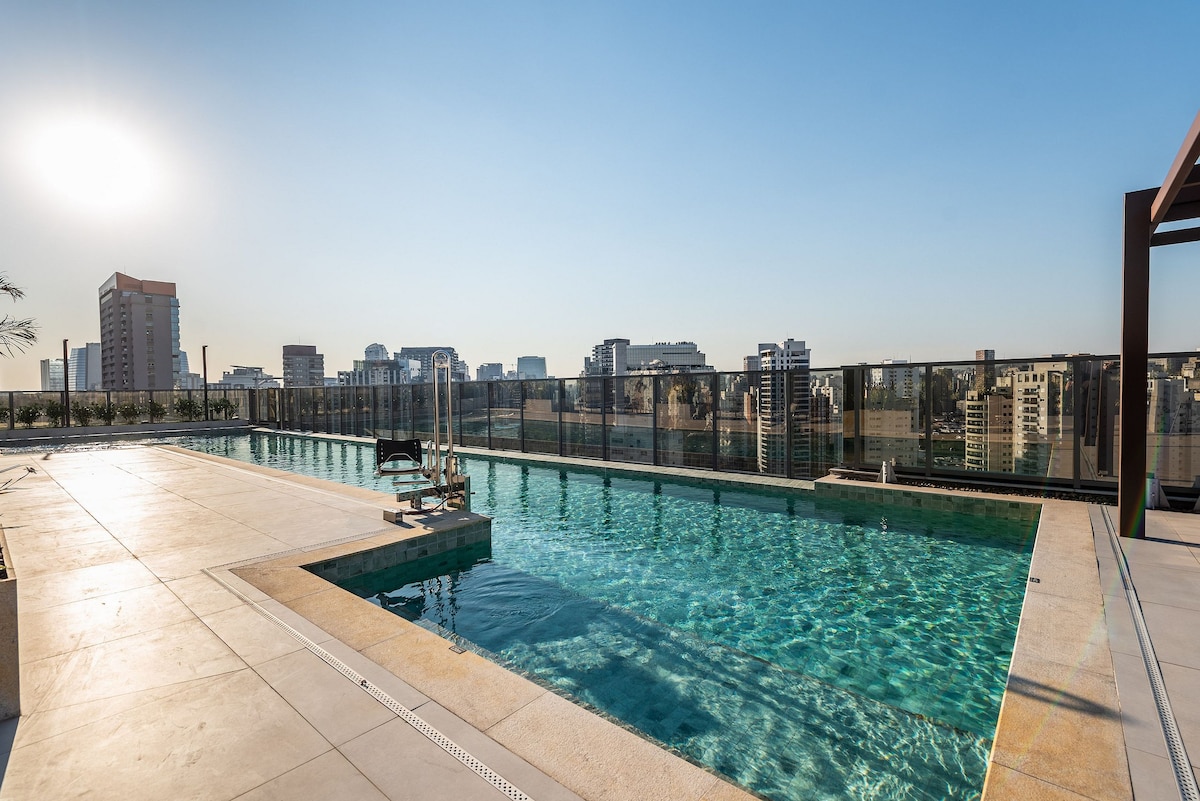 Studio with the largest layout in Today Faria Lima and open view of Av. Brigadeiro Faria Lima. Includes retractable reclining sofa, 55” Smart TV, fast Wi-Fi, washer/dryer and full kitchen with 4-burner cooktop, fridge, 42L air fryer (oven), Nespresso machine and water filter. Building amenities include rooftop pool, sauna, gym, coworking and laundry. Prime location: 1-minute walk to Insper and Anhembi Morumbi, across from Natural da Terra and services.