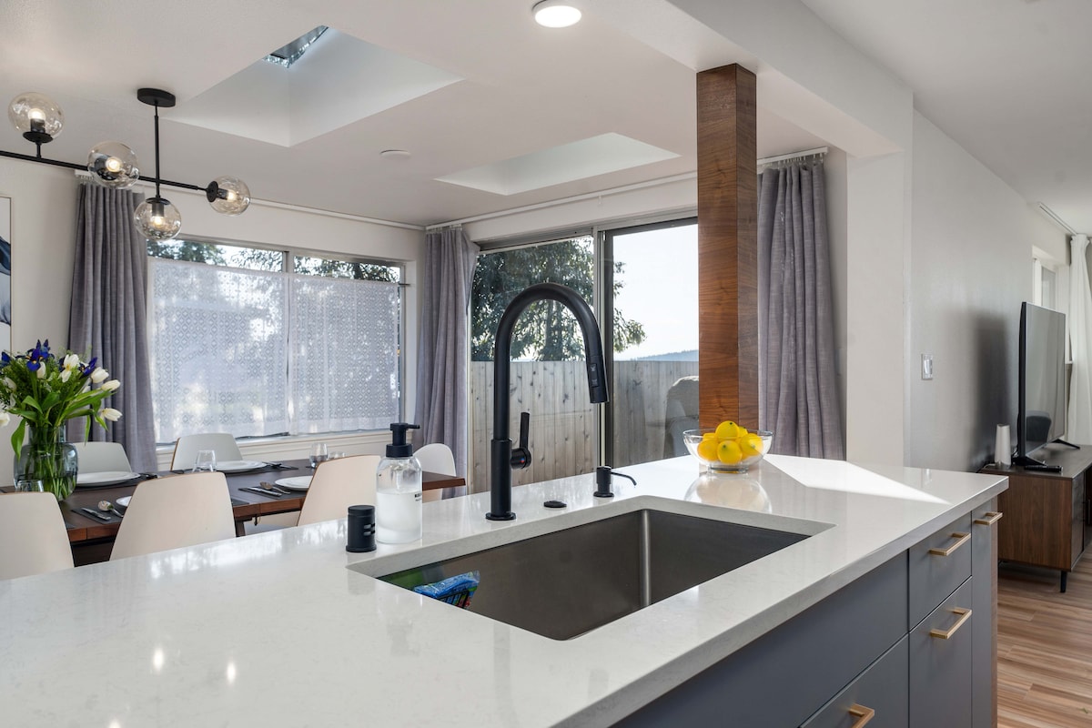 Gadsimta vidus mūsdienu iedvesmota oāze ar skatu uz mežainu Kobajaši parku un Chambers Creek - labi izmantota vasarā. Šis mājoklis, ko projektējis slavenais Takomas arhitekts Rasels Garisons, lepojas ar oriģinālu šarmu ar logiem no grīdas līdz griestiem un lielu aptinamo terasi. Atrodas divu jūdžu attālumā no Chambers Bay un golfa laukuma, kurā notika 2015. gada US Open. Iepazīstiet Reinīra kalnu, Olimpisko nacionālo parku un visu, ko piedāvā Sietla/Takoma. Saimnieki dzīvo kaimiņos un ir pieejami, lai atbildētu uz jautājumiem.