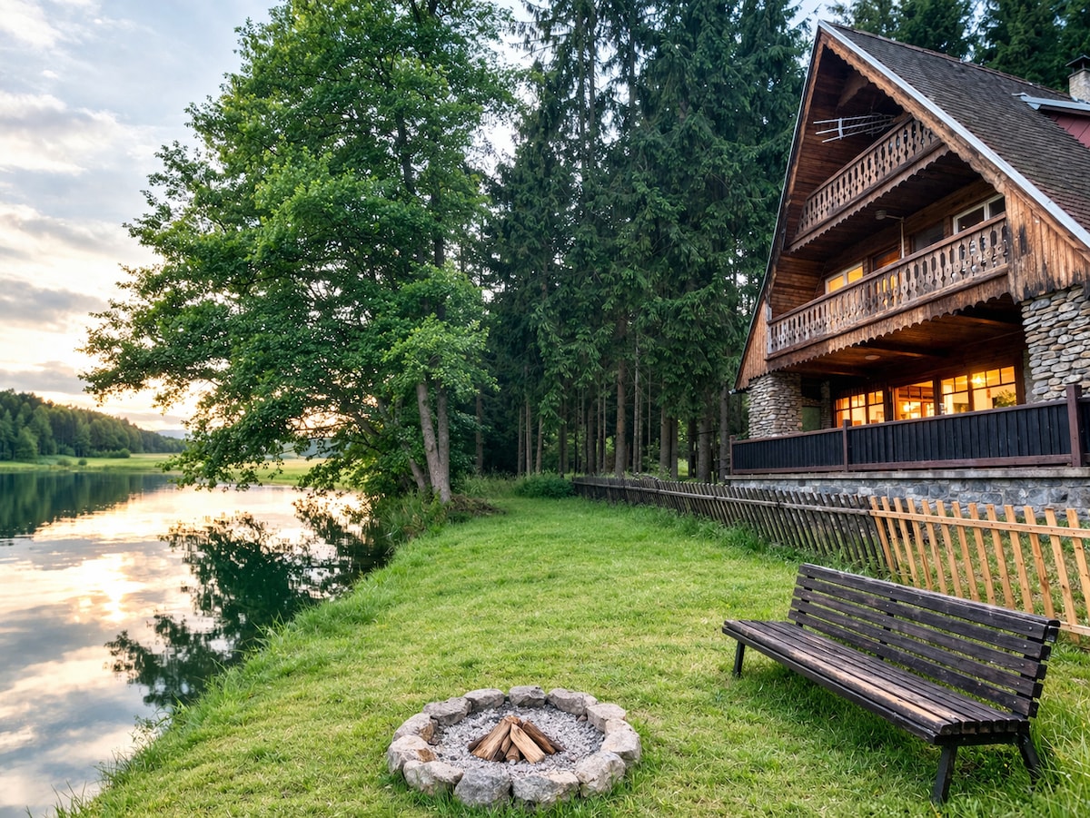 Liela, plaša māja, tikai dažu metru attālumā no ezera. Meža malā. Mājā ir maksimāls komforts, 3 guļamistabas, katrai no tām ir sava terase. Plaša dzīvojamā istaba ar kamīnu un skatu uz ūdeni. Aprīkota virtuve, ēdamistaba terasē. 15 minūšu attālumā no vēsturiskās Pisekas pilsētas un 10 minūšu attālumā no Blatnas pils. Mūsu mājoklis ir kluss, ērts, un tajā ir pieejama neliela laiva. Māja ir nožogota.