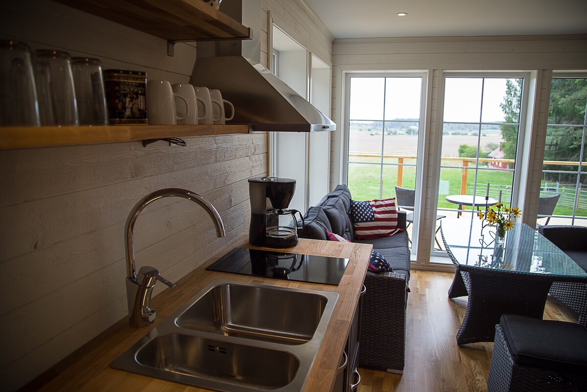 Atpūtieties šajā unikālajā un mierīgajā mājoklī. Tikai 10 minūšu brauciena attālumā no pilsētas centra. Māja ir aptuveni 65 kvadrātmetru liela un jaunuzcelta, bet ar patiesi lauku stilu. Šeit jūs atradīsiet pilnībā aprīkotu virtuvi ar lielāko daļu nepieciešamo lietu. Neliela, bet gudra vannasistaba ar tualeti un dušu. Veļas mazgātava ar žāvētāju. Plaša divguļamā guļamistaba, kā arī divguļamā gulta TV istabā. Šeit jūs dzīvojat ar mežu tepat aiz stūra un diviem dabas rezervātiem ar vairākām pārgājienu takām un putnu ezeriem tuvumā. Vasaras laikā atsevišķas naktis pēc pieprasījuma.
