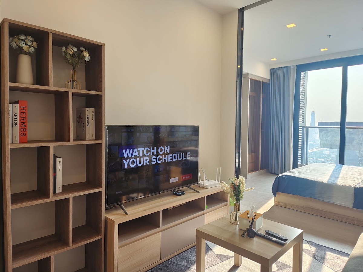 Atpūtieties un skatieties uz nemitīgi mainīgo Chao Praya upes skatu gan pa dzīvojamās istabas, gan guļamistabas milzīgajiem logiem. Dodieties saulrietā un pastaigā uz Asiatique nakts tirgu tikai dažu soļu attālumā. Šī elegantā augstā stāva istaba, kas atrodas vienā no Bangkokas augstākajām ēkām un no kuras paveras skats uz logiem, piedāvā vietējās pilsētas dzīves garšu. Kopīgas augstākās standarta papildērtības ietver 360° bezgalības baseinu, sporta zāli, basketbola laukumu, debesu atpūtas telpu un daudz ko citu.