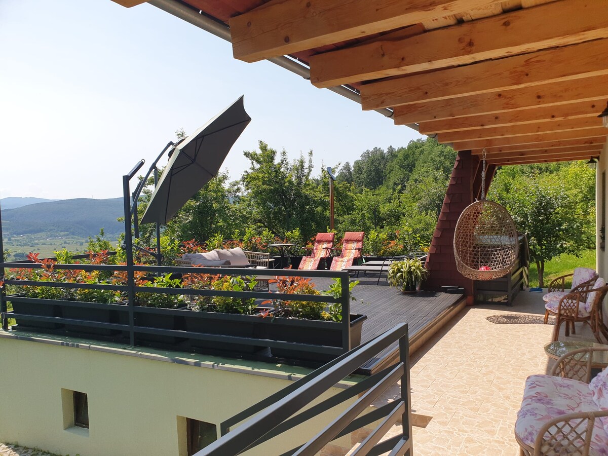 Šī nesen atjaunotā tradicionālā, lauku stila kotedža ar divām guļamistabām, kas atrodas Transilvānijas Karpatu kalnos, sniedz komfortu, mieru un izcilu skatu. Ar lieliem dārziem, rotaļu laukumu, grila terasi, lielu peldbaseinu un burbuļvannu. Izklaide iekštelpās: viedtelevīzija un ļoti ātrs Wi-Fi. Vietējais reģions var lepoties ar plašu aktivitāšu klāstu visa gada garumā. Tā ir viegli sasniedzama no Oradjas un Klužas-Napokas lidostām. Mums bez maksas ir pieejami 2 pieaugušo velosipēdi un 1 bērnu velosipēds.