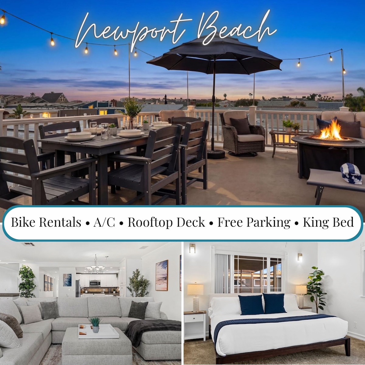 Top 1% in Newport — sip wine at sunset as sailboats drift by from your private rooftop deck. Steps from the sand, Newport Pier, and waterfront dining. Harbor Lookout is newly-built and designed for laid-back luxury with cool A/C ❄️ and EV parking (rare). Why guests love it ✓ Rooftop harbor views ✓ Prime beach location ✓ Cool A/C ✓ Garage + EV charger ✓ Chef's kitchen, wine & coffee bar ✓ Beach essentials ✓ Warm outdoor shower ✓ 75" TV + Sonos music, and fast Wi-Fi Rated 4.98★ Guest Favorite