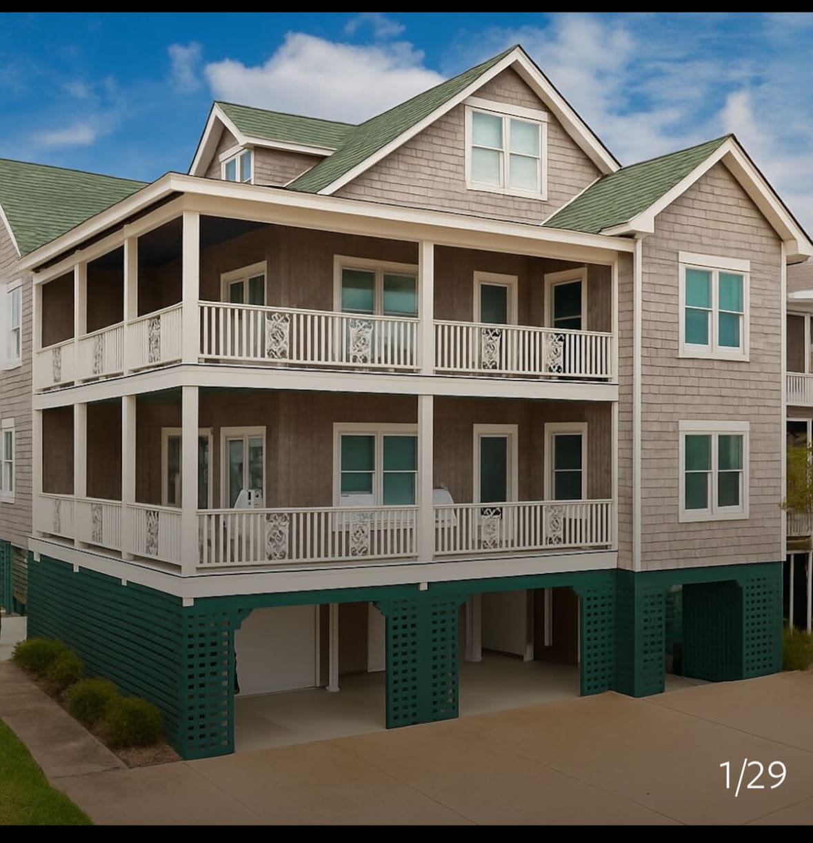 Beautiful roomy three bedroom two bathroom mid level villa that is approx 50 yards from beach entrance. Bikes, boogie boards, beach towels, chairs and umbrella available for use. You have to go up one flight of steps to enter living area. All living area is on one floor. Large wrap around porch. Walk to shops, dining and Johnny Mercer pier