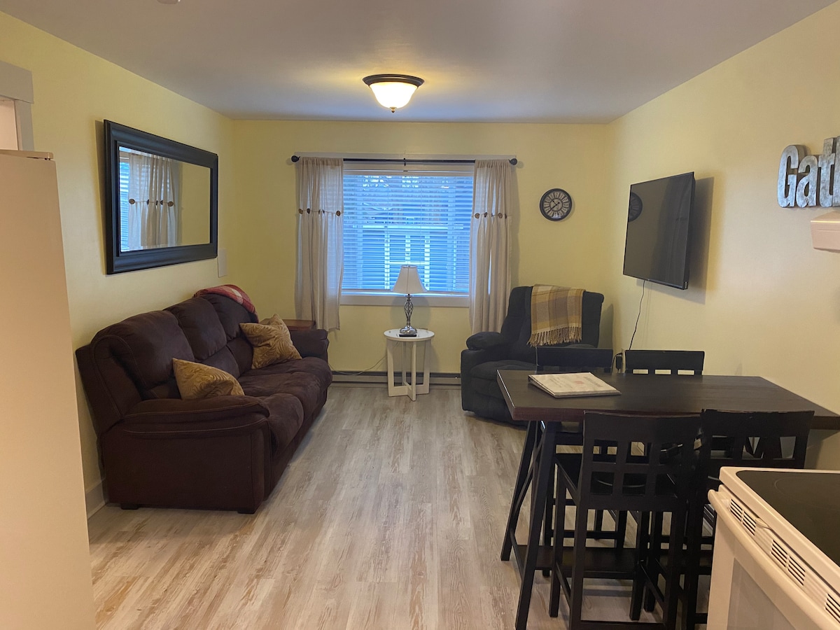 Tuvu Turning Stone Resort, NYS Thruway, & 15 minūšu brauciens līdz Silvānas pludmalei. Vienība atrodas Oneidas centrā pastaigas attālumā no restorāniem, kafejnīcām un iepirkšanās centriem. Vienība atrodas tradicionālās 2 stāvu pilsētas mājas otrajā stāvā. Šī ir 1 guļamistabas vienība (pieejama luksusa piepūšamā gulta). Gultasveļa, dvieļi, labi aprīkota virtuve, WiFi, TV, Roku, A/C, neliels sildītājs un ventilators. Tikai īsas pastaigas attālumā no pilsētas parka vai līdz Oneida Rail Trial skriešanai, riteņbraukšanai vai pastaigām! Viss mājokļa komforts, kamēr esat prom!