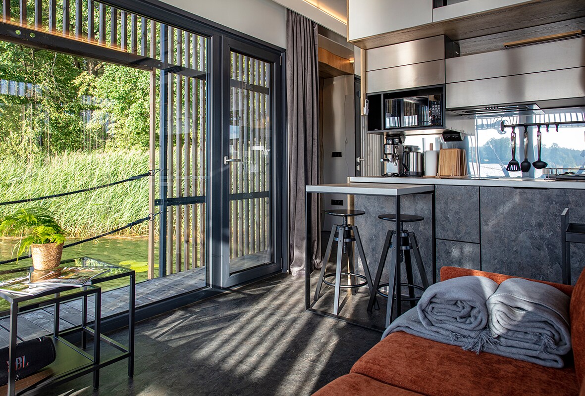 Ūdens māja sastāv no 2 guļamistabām, 2 vannasistabām un dzīvojamās istabas ar virtuvi. Turklāt mājā cita starpā ir gaisa kondicionētājs, veļas žāvētājs, trauku mazgājamā mašīna, kafijas automāts un daudz kas cits. Tai ir piekļuve ezeram - pludmalei + molam. Īpašumā ir bērnu rotaļu laukums, batuts, ugunskura vieta, laiva, ūdens velosipēds, 10x5m baseins (atvērts no jūnija līdz septembrim). Tajā ir arī SPA (somu pirts, masāžas ķīpa, sāls grota) ar skatu uz ezeru.