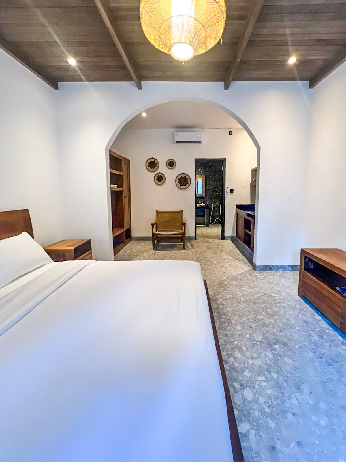 Little Ripper new boutique hotel is home to 6 luxurious rooms and beautiful lagoon-like pool in its garden. The loft is located on the second floor with a patio facing the pool. It is divided into two floors with the sleeping area upstair. The loft and property is decorated with dark local wood & natural terrazo finishing and a mix of modern & antique furnitures. The loft has a seating area, working desk, wardrobe, queen-size bed, beautiful shower with organic amenities, and a small fridge.