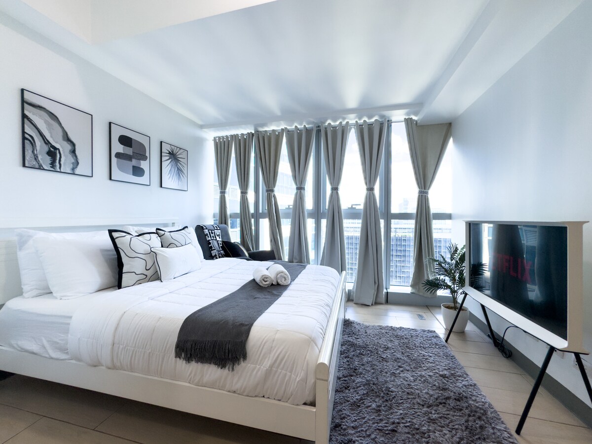 Rezervējiet šo luksusa mājokli BGC centrā. Viss ir tikai pāris soļu attālumā. Galvenie biroji un augstākās klases tirdzniecības centri ieskauj Uptown Parksuites. Izbaudiet kosmopolītisku atpūtu tirdzniecības centrā Uptown Mall. Izpētiet unikālas ēdienu un iepirkšanās koncepcijas. Ballējieties visu nakti izcilos bāros tieši pie jūsu namdurvīm. Atpūtieties mūsu gadsimta vidus modernajā guļamistabā. Atpūtieties "queen" izmēra gultā un papildu dīvāngultā. Ērtības ietver 55 COLLU viedtelevīziju, 400 MB/S internetu, mācību zonu un privātu balkonu.