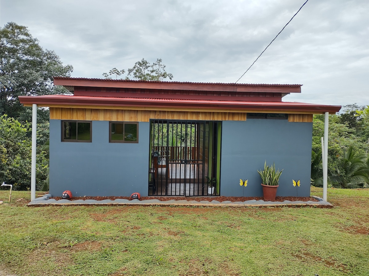 Casa de campo de dos habitaciones, con área de cocina equipada, desayunador y sala de estar, rancho y piscina (compartido) ideal para alojarte en un ambiente tranquilo de paz y privado rodeado de naturaleza, diversa fauna y amplio espacio exterior (jardín y plantaciones) a solo 20 minutos de Quepos centro y próximo a diferentes lugares turísticos y playas de la zona (Manuel Antonio, playa linda, Biesanz)
