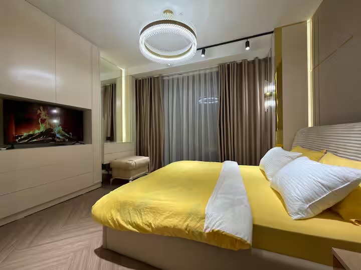 Moderna studija ar panorāmas skatu KAZAHSTĀNAS dzīvojamajā kompleksā Šī stilīgā studija ar panorāmas logiem un unikālu dizainu sniegs jums mājīguma un brīvības sajūtu. Plaša dzīvojamā zona, ērta gulta, pilnībā aprīkota virtuve un moderna vannasistaba — tas viss jūsu ērtībai. Dzīvoklis ir gaišs un mājīgs, ideāli piemērots atpūtai vai darbam. Visa ceļojuma laikā ir pieejams Wi-Fi, televizors un gaisa kondicionētājs. Diennakts bezkontakta reģistrēšanās ir nodrošināta!