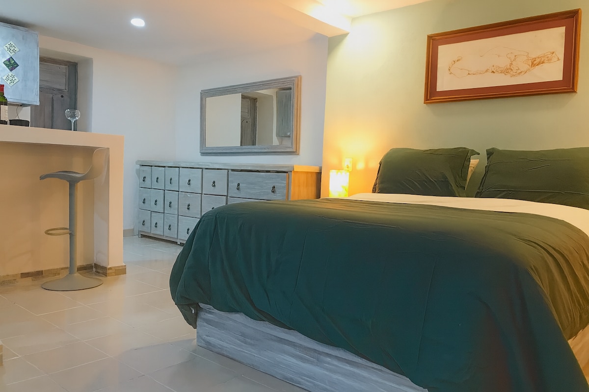 Atpūtieties šajā mājīgajā loftā ar skatu uz kalniem un nelielu skatu uz Taksko centru. Ideāli piemērots 3 cilvēkiem, tajā ir Queen izmēra gulta, divguļamā gulta, privāta vannasistaba, Smart TV un piekļuve kopīgajam jumtam ar dzīvojamo istabu, ēdamistabu un panorāmas skatu. Atrodas Calle Tercera de Sierralta, 8–9 minūšu gājiena attālumā no Zócalo un Santa Prisca. Ideāla telpa pāriem, draugiem vai ceļotājiem, kas meklē komfortu un mieru.