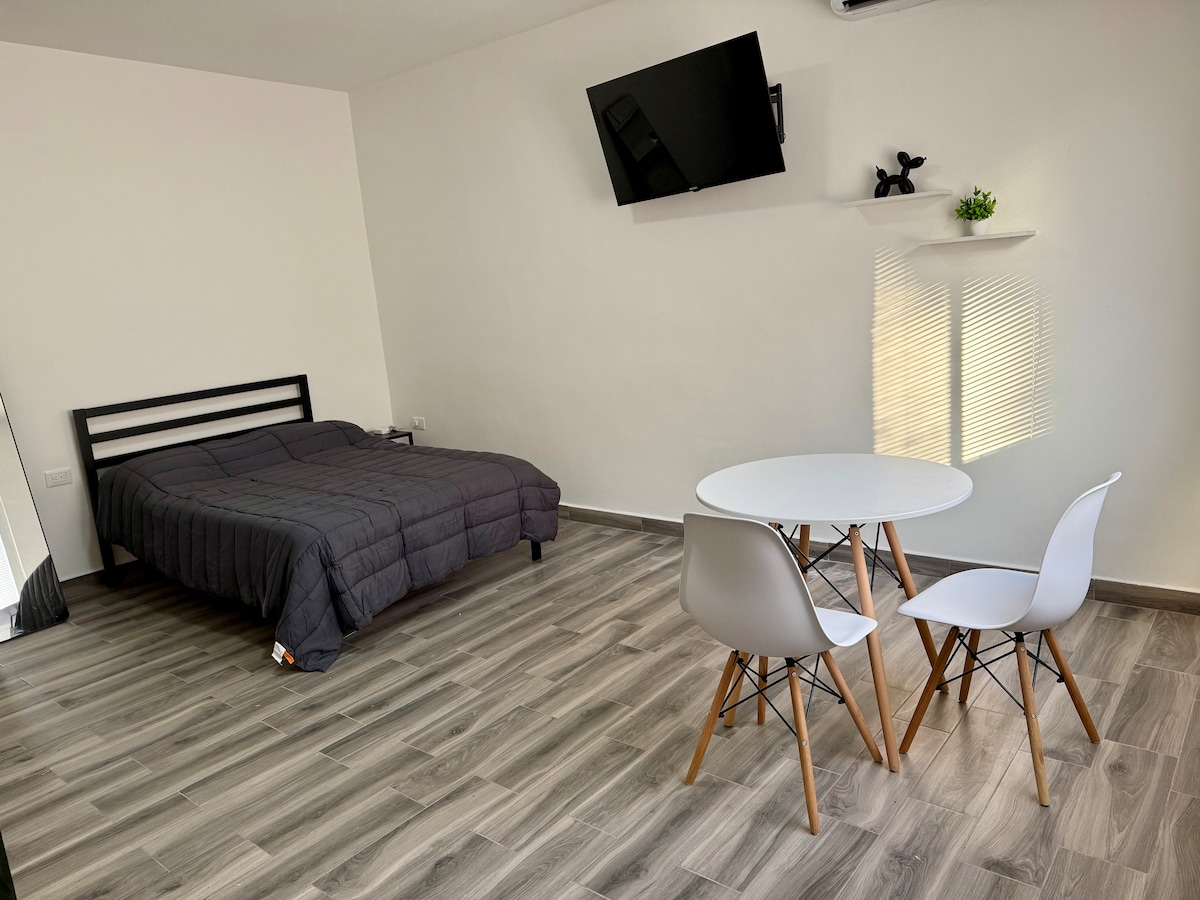 Apbrīnojams un unikāls lofts, kas ir ideāli piemērots atpūtai. Tajā ir 1 guļamistaba ar "king" izmēra gultu, viedtelevīzija, darba vieta, atpūtas krēsls, pilna vannasistaba, pilna vannasistaba, mini bārs, mikroviļņu krāsns, mikroviļņu krāsns, mikroviļņu krāsns, kafijas automāts, kafijas automāts, gaisa kondicionētājs un Wi-Fi. Tā atrodas centrālā rajonā ar ērtu piekļuvi jebkurai vietai, tā ir tuvu galvenajai avēnijai, kur atradīsiet dažādus transporta līdzekļus. 8 min smalkmaizīšu parks 15 minūšu attālumā no Sanpedro Garza 10 min no pilsētas centra