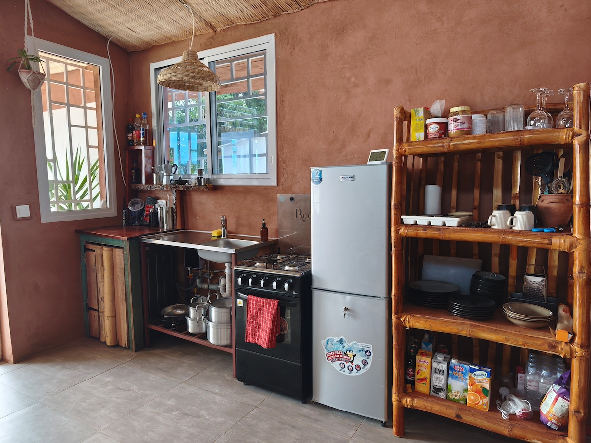 šī 2 zem tvaika nosūcēja māja ir ļoti piemērota 2 pāriem ,katrā pusē ir guļamistaba [2 personām] duša ,tualete, izlietne, pilnīga virtuve ar saturu un viesistaba ,terase un dārzs ar skaistiem augiem , ir arī ugunskura vieta un labs Eiropas un vietējais veikals , ir kāds, kas jums palīdz ar visu, kā arī uzņemt lidostu, aptuveni 3 km attālumā no jūras, ir pieejams taksometrs, izmaksas nav dārgas, viņš jūs atved un var parādīt visas jaukās Gambijas vietas