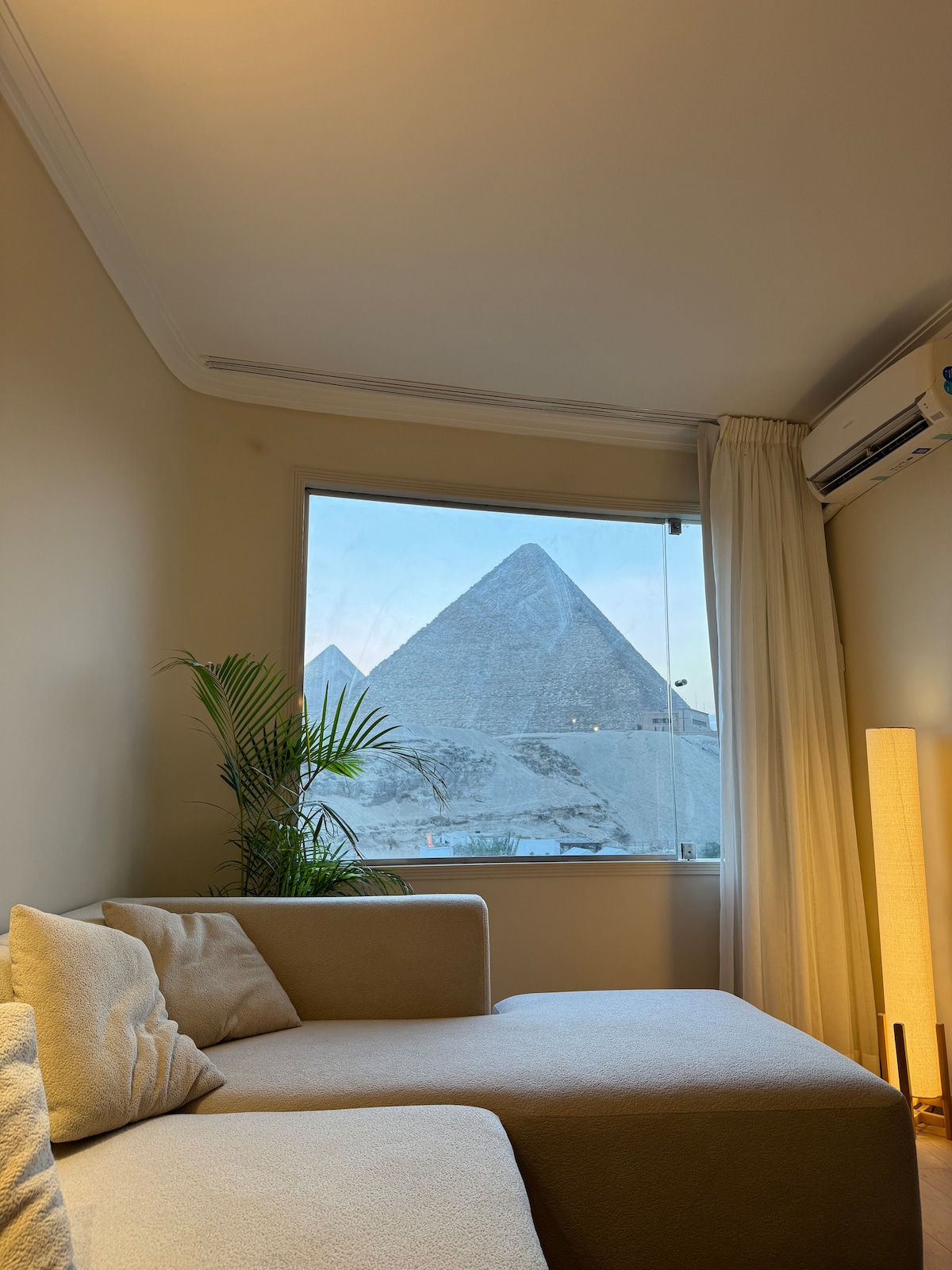 Atpūtieties šajā greznajā jumta atpūtas vietā ar panorāmas skatu uz Lielajām piramīdām. Izbaudiet karalisku komfortu skaisti iekārtotā telpā, kurā apvienota mūsdienīga elegance un Ēģiptes šarms. Tikai 12 minūšu attālumā no jaunajiem Piramīdu vārtiem un 10 minūšu attālumā no Lielā Ēģiptes muzeja – ideāla atrašanās vieta pētniekiem. Pilnībā aprīkotā virtuve un plašā terase padara to par neaizmirstamu uzturēšanos.