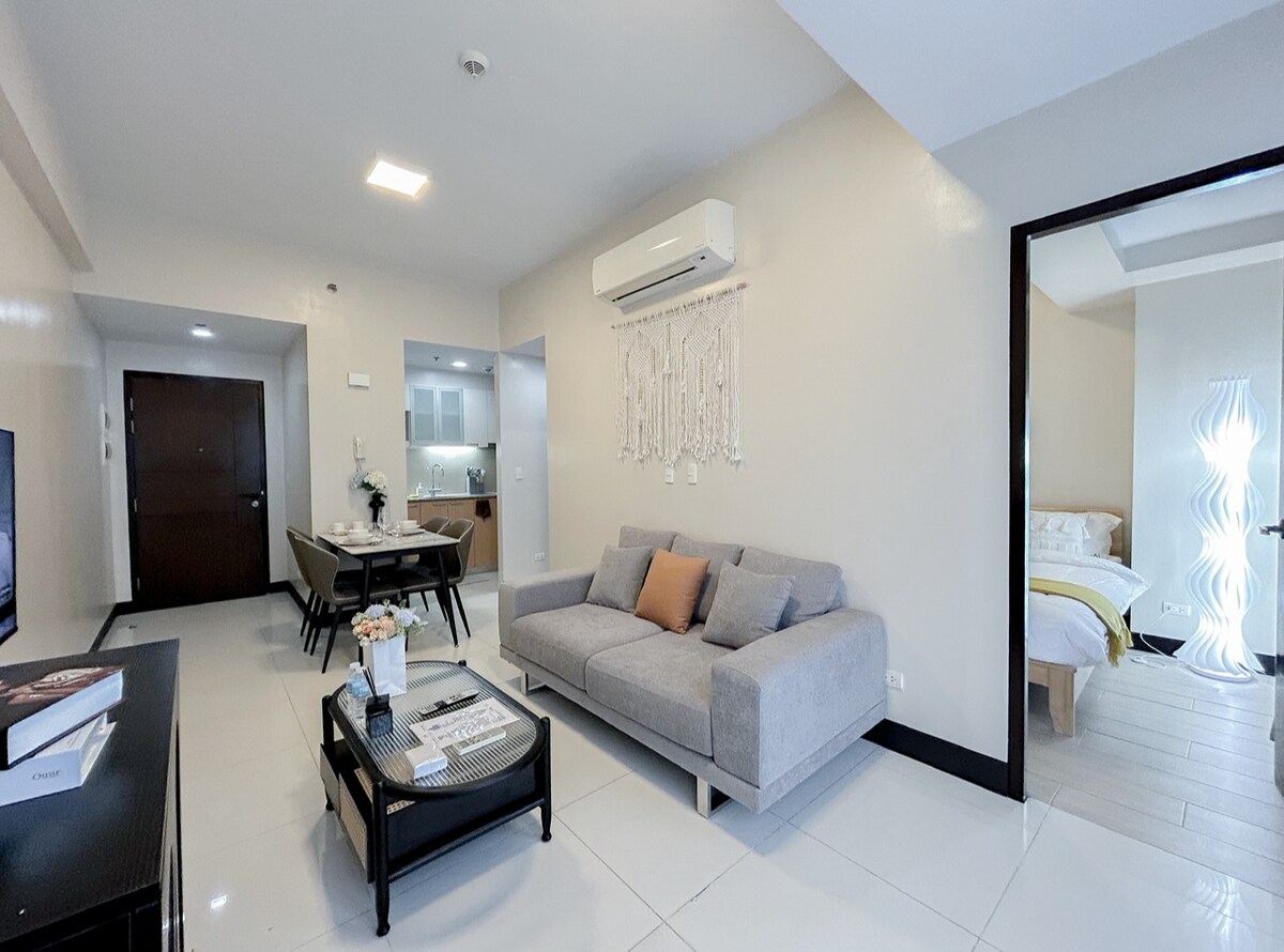 Atpūtieties šajā pilnīgi mājīgajā, modernajā un dinamiskajā 1BR daudzdzīvokļu namā, kas atrodas ērtā VIETĀ MANČESTRĀ, Mactan Newtown, Lapu-lapu pilsētā. Tas ir netālu no 5 zvaigžņu kūrortiem, restorāniem, kafejnīcām un lielveikaliem. - 10-15 minūšu brauciena attālumā no Maktanas lidostas - Piekļuve viedai slēdzenei - 50 Mb/s WI-FI - Bezmaksas Netflix - Pilnībā aprīkota virtuve (SVARĪGS PAZIŅOJUMS: pirms rezervācijas veikšanas, lūdzu, pārskatiet tālāk sniegtos īpašuma aprakstus)