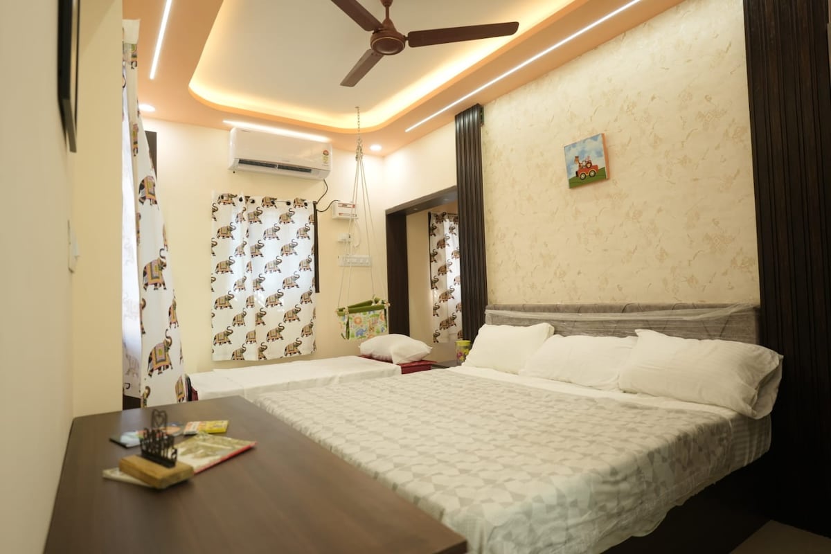 A newly renovated 2 BHK with A/C, tasteful furniture, lighting, brand new amenities @ heart of the city, a peaceful, residential location. We aspire to provide friendly, clean, affordable stay. Hall : Sofa, Diwan, 43" LED TV, DTH, Wifi Dining : 4 seat table cum workspace Bedroom (2) : 2 Queen size beds, 2 floor mattress , A/C, Window cradle hanger Kitchen : Fridge, Induction stove, Basic utensils Bathroom (2) : Liq soap, Geyser, Western toilets Utility : Washing m/c, UPS, Cloth drying stand