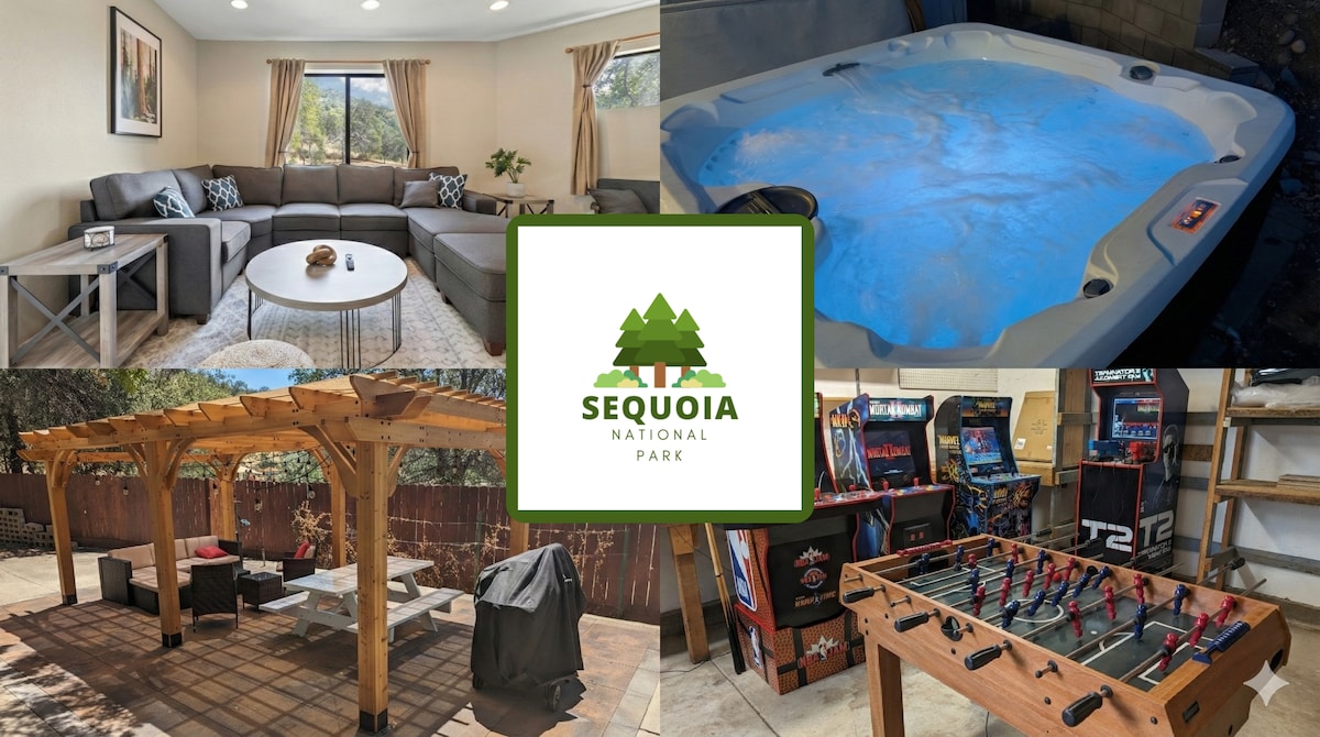 "Šis bija burtiski LABĀKAIS AirBnB, kurā mēs jebkad esam uzturējušies - bez šaubām! Māja atrodas neticamā vietā..." - Aleksis '25 - 4 jūdzes līdz Sequoia nacionālajam parkam, 5 jūdzes līdz Kaweah ezeram ar skatu - Dodieties pārgājienā pa privātu taku, lai īpašumā atrastos mājoklī. - Ātrs Wi-Fi, burbuļvanna, elektromobiļu lādētājs, arkādes telpa - 4k HDTV - 1. guļamistabā ir divguļamā gulta, galvenā vanna, darba vieta. - 2. guļamistabā ir 2 pilnas divstāvu gultas, vannasistaba, darba vieta. - 3. guļamistabā (apakšējā līmenī) ir 1 divguļamā gulta, vannasistaba, minivirtuve un privāta ieeja.