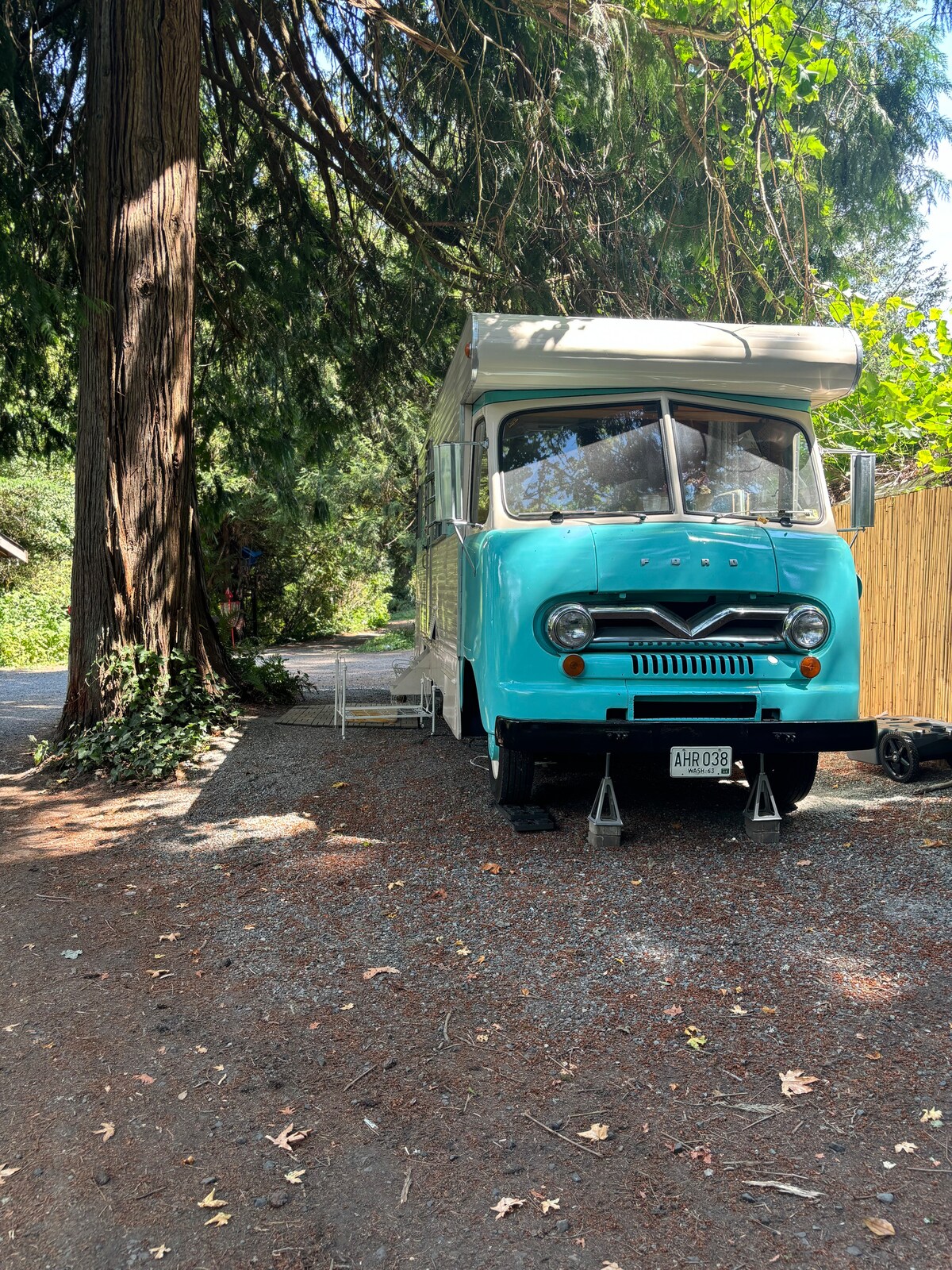 Nāciet apmesties "Isabel"... retro stila Ford RV, ko ieskauj majestātiskas ciedras mierīgā vidē. Viņai ir oriģināli koka paneļi ar uzlabotu sildītāju/maiņstrāvas bloku, lai sniegtu jums mājīgu pieredzi jebkurā gada laikā. Viņa ir novietota mūsu īpaši lielajā stāvlaukumā, izņemot mūsu kopīgos priekšējos dārzus/terasi ar bezdūmu ugunskura vietu/grilu, lai baudītu āra kulināriju vai ugunskurus. Viņas nelielajā vannasistabā ir izlietne un tualete, kā arī āra karstā dušas telts blakus 8x14 pēdu peldbaseinam/burbuļvannai!