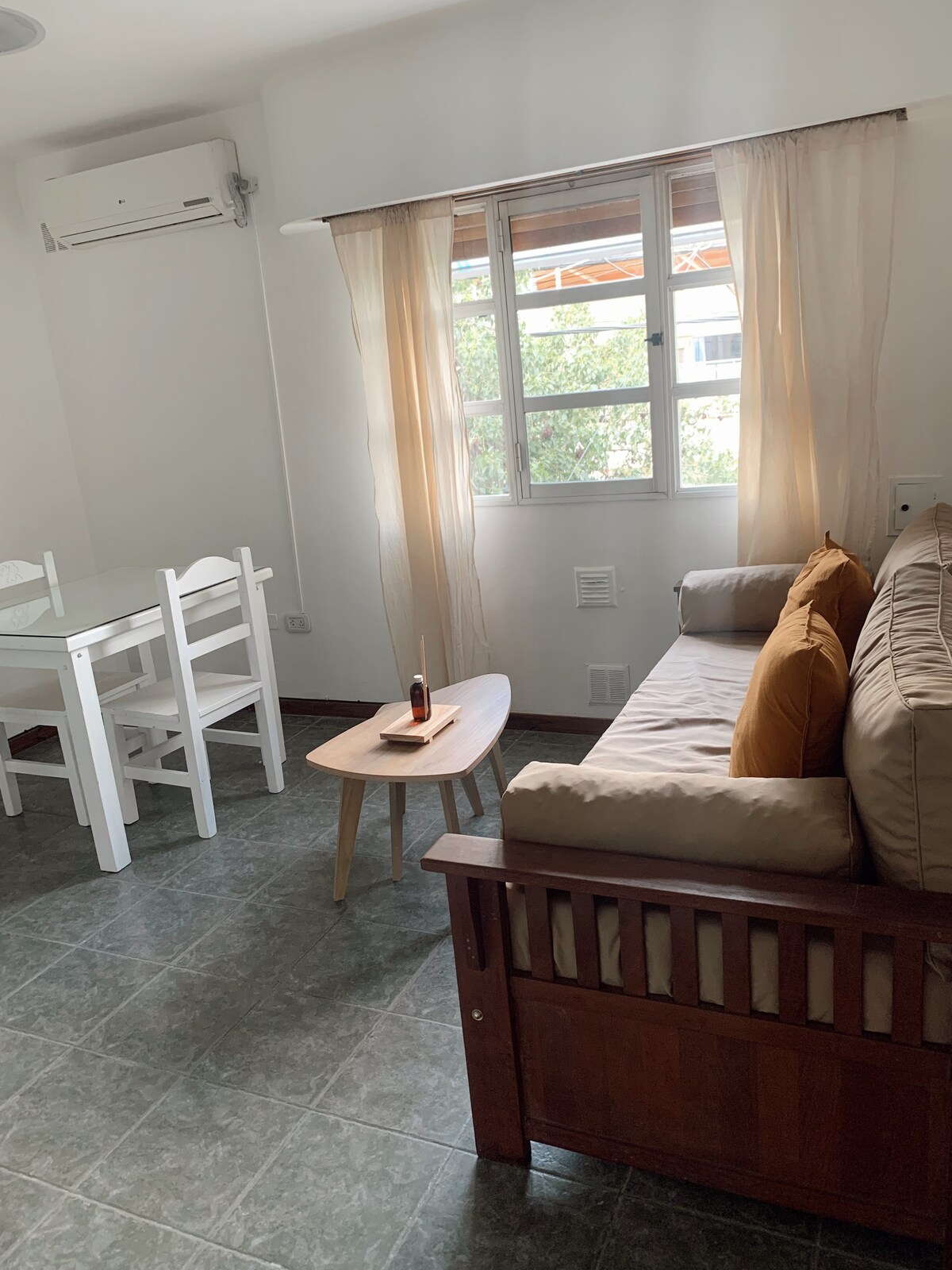 La Pausa Acogedor dpto totalmente equipado, ideal para estadías cortas. Cuenta con dormitorio con ropa de cama, baño privado con agua caliente y toallas, amplio living comedor con sofá cama, cocina integrada con elementos básicos y estacionamiento propio. aire acondicionado en todos los ambientes. Su patio y espacio de asador se destacan por un caldén centenario que lo hace único, brindando un entorno natural y especial. Perfecto para viajes de descanso o trabajo en una ubicación accesible.